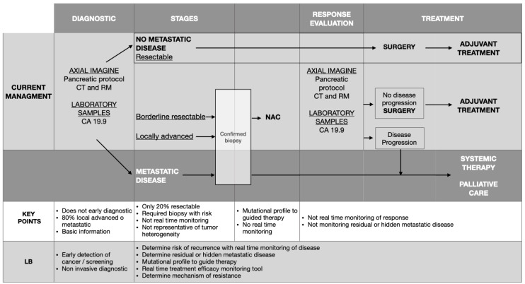 血清标志物碳水化合物抗原19-9(CA19-9)和增强计算机断层扫描(CT)是诊断和监测反复的主要方法。然而,CA19-9在敏感性和特异性方面均存在局限性(约80%和约75%),并且并非仅限于胰腺癌。另一方面,CT扫描主要检测宏观疾病反复,适用性有限。此外,使用实体活检进行组织学分析存在报告的局限性和风险。