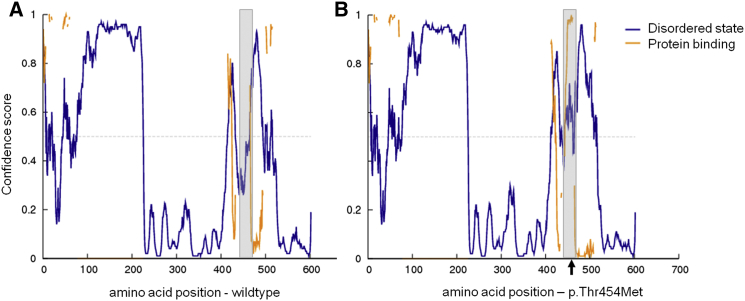 使用 DISOPRED生成了野生型变体 (A) 和变体版本 p.Thr454Met (B) 的 GRHL3 内在无序概况。蛋白质结合位点也在无序区域内标出。黑线表示变体位置,在该位置周围,一组19个连续氨基酸(位置 443 至 461)被新注释为“无序”或“无序蛋白质结合”,表明该区域的结合能力增加。