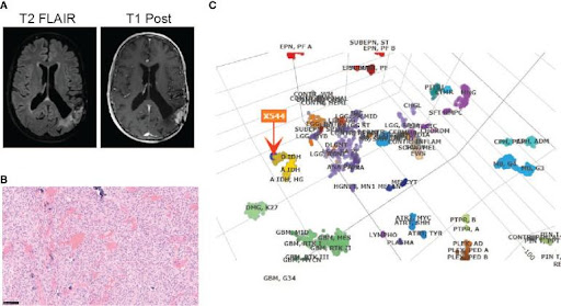 图 2:在最近一次肿瘤切除前通过(A) MRI诊断少突胶质细胞瘤、IDH 基因基因检测突变和 1p/19q 共缺失、CNS WHO 3 级;(B) H&E 染色 (20X) 和(C)最近肿瘤切除的肿瘤样本的 DNA 甲基化分析。