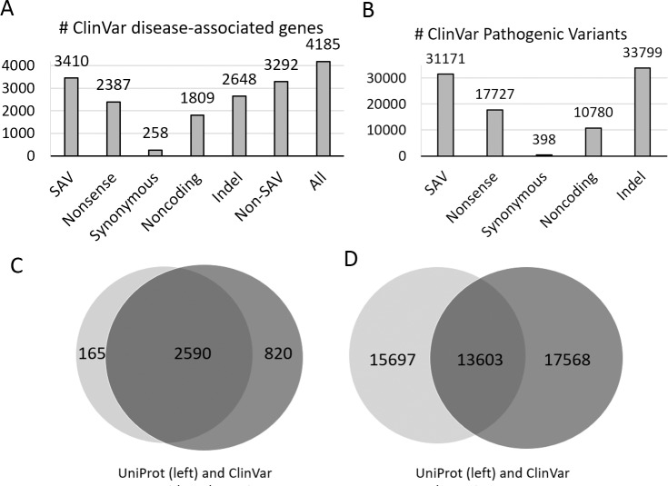 A) 具有不同类型变异的 ClinVar 疾病相关基因的数量。非 SAV 类别结合了无意义突变、同义突变、非编码和插入缺失的类别。 B) ClinVar 疾病相关基因中不同类型变异的数量。 C) 来自 UniProt 和 ClinVar 的具有致病性 SAV 的基因Venn图。 D).来自 UniProt 和 ClinVar 的致病变异的维恩图。