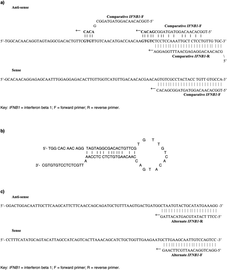 图1. IFNB1 先进端粒长度基因检测方案的的生物信息学分析 a)比较性IFNB1 先进端粒长度双链寡聚体标准,b)与比较性IFNB1反义寡聚体形成发夹环,c)替代IFNB1 先进端粒长度双链寡聚体标准。
