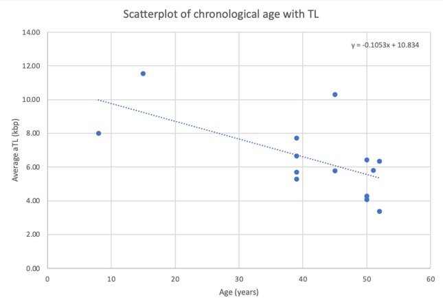 图4. 使用替代IFNB1单拷贝基因进行先进端粒长度分析的年龄和端粒长度(端粒长度)的散点图。