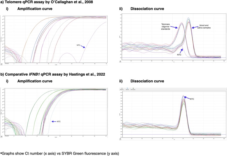 图2. 使用没有添加质粒(pBR322)的三步PCR方案进行的遗传分析。a)端粒qPCR检测方法,b)比较IFNB1 qPCR检测方法。