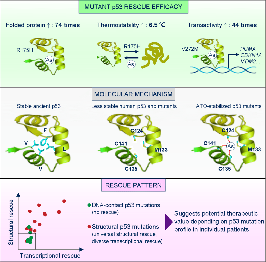 然而,总体而言,ATO在非APL白血病上的临床缓解率低。发现APL特有的PML-RAR以外的ATO作用靶点,正确选择可能取得疗效的病人,是实现ATO“老药新用”的重要环节。近日,上海交通大学医学院附属瑞金医院 卢敏研究员等发表在 Cancer Cell 上的工作揭示ATO可直接靶向结构突变型p53,促使这一类蛋白更容易折叠并恢复其抑癌功能。该研究显示, 相比于已经报道的p53靶向化合物低下或者难以检测的p53复活效率,ATO在复活p53效率上具有一到多个数量级上的优势,并具明确的p53突变适用谱,即诱导p53不折叠的那一类“结构型突变”。