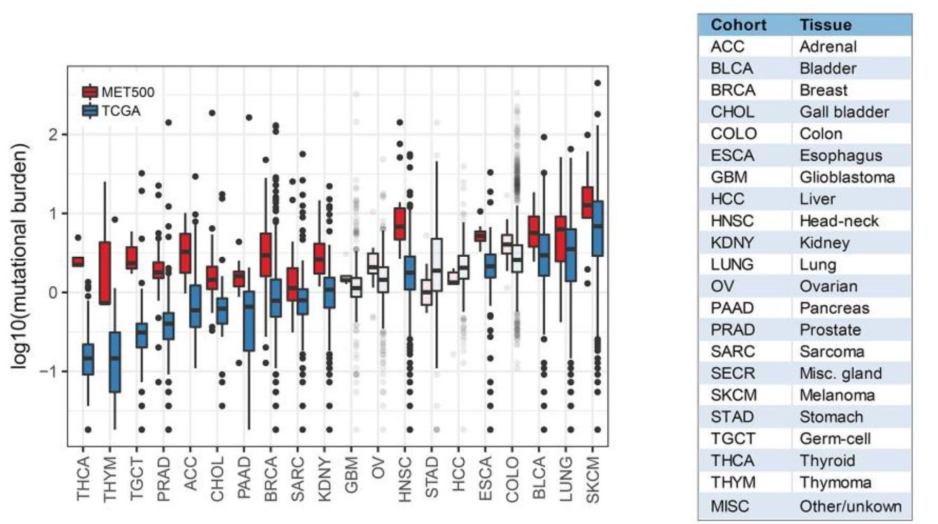 图3:不同转移性肿瘤的突变负荷