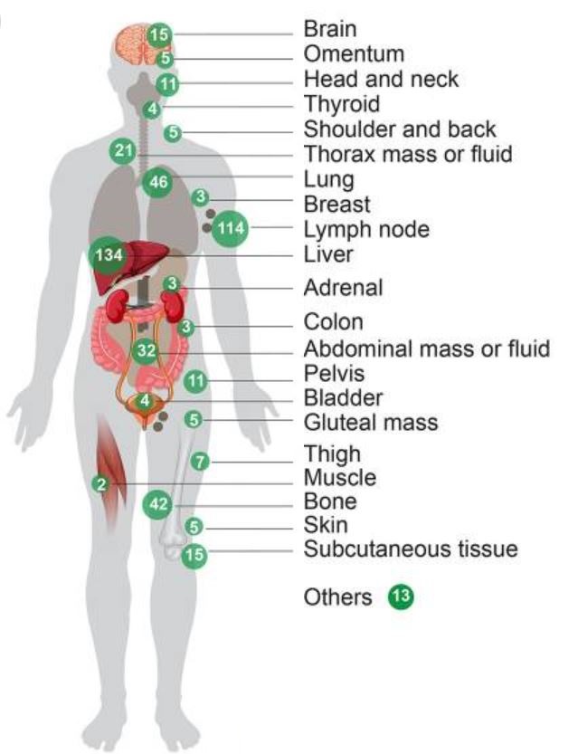 图2突出显示了MET500队列中分析的多种转移部位(n>30)。贼常见的转移部位包括134例肝脏、114例淋巴结、46例肺、42例骨和32例腹腔实质/腹水/胸腔积液。
