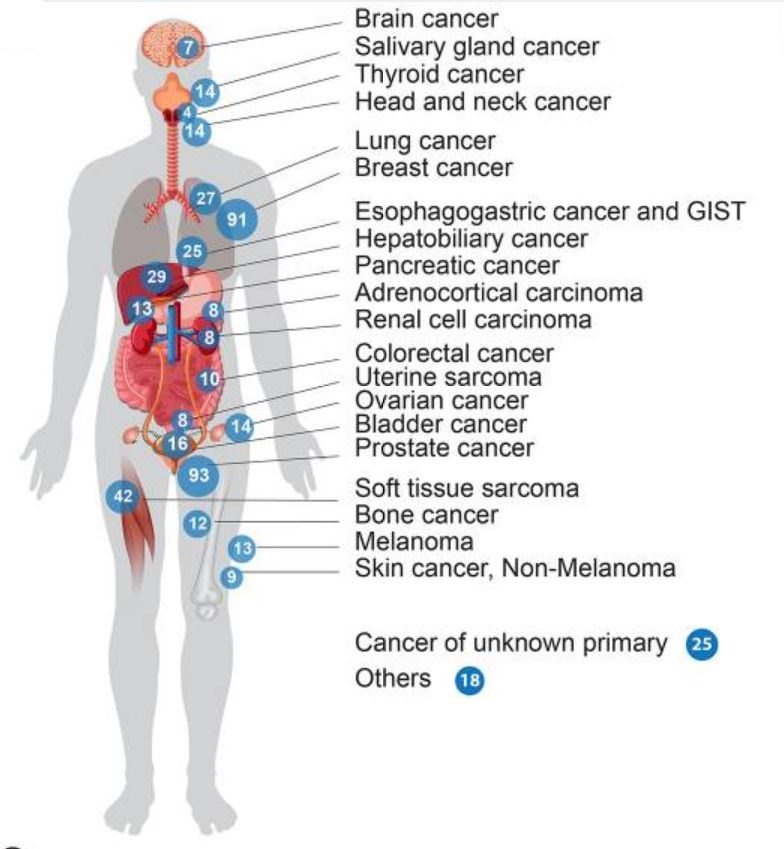 通过下图1描绘了MET500队列中的癌症类型(n=20)。肿瘤转移大数据队列中前三大癌症类型包括93例(18.6%)转移性前列腺癌、91例(18.2%)转移性乳腺癌和42例(8.4%)软组织肉瘤。还有25例(5%)原发不明癌(CUP)。