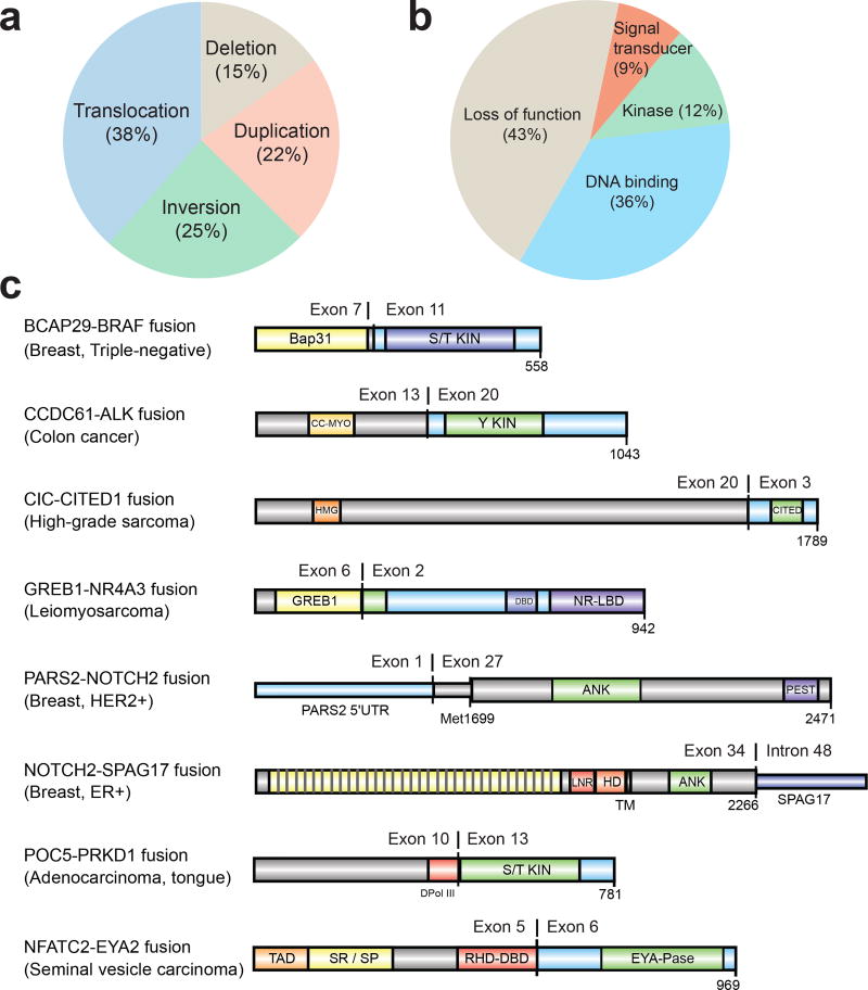 为鉴定激活性和失活性基因融合,转移性肿瘤基因突变基因解码分析了来自496例转移性肿瘤RNA的868个转录组文库。这些融合连接点涉及12,027对独特基因对,平均每个肿瘤34个基因融合,源自各种结构异常(图3a)。不同肿瘤类型的融合负担存在较大差异。199例(39.8%)至少harbored一个推定致病性融合,其中138个是激活性融合,103个是有害融合。激活性融合可分为DNA结合(n=88)、蛋白激酶(n=29)和信号转导(n=21)(图3b)。失功能融合可分为典型肿瘤抑制基因(n=59)、染色质修饰基因(n=35)和参与细胞粘附的基因(n=9)。贼常见的融合肿瘤抑制基因是NF1(n=18)、TP53(n=11)、PTEN(n=11)和RB1(n=6)。有趣的是,佳学基因在转移性癌症中鉴定出一系列8对新的融合对,基因解码认为这些融合对具有致病性(图3c)。其中包括带有新合作伙伴的激活性FGFR、BRAF和ALK融合,扩展了这些可临床靶向的融合的融合伙伴和癌症类型范围。具有功能域的新基因融合包括子宫平滑肌肉瘤的GREB1-NR4A3、舌头多形性低级腺癌的POC5-PRKD1和未分化高级肉瘤的CIC-CITED1。Notch融合分为两类,预计对γ-分泌酶抑制剂敏感(如NOTCH2-SPAG17)和不依赖于γ-分泌酶加工的融合(如PARS2-NOTCH2)。