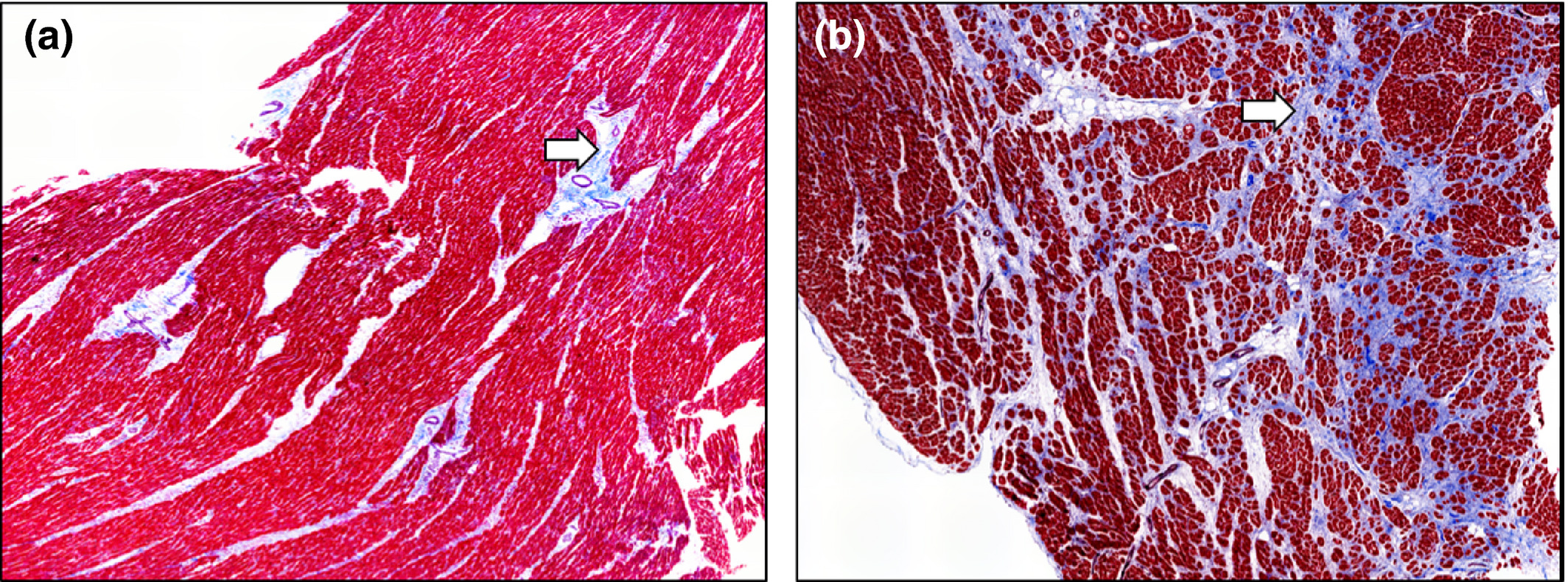 非病变(a)和病变终末期心力衰竭患者的心脏的左心室的显微分析。纤维化含量(Masson三色染色,a和b区,放大20倍)在非病变心脏中以3%计算,而在病变心脏中以30%计算(白色箭头表示纤维化区域)。