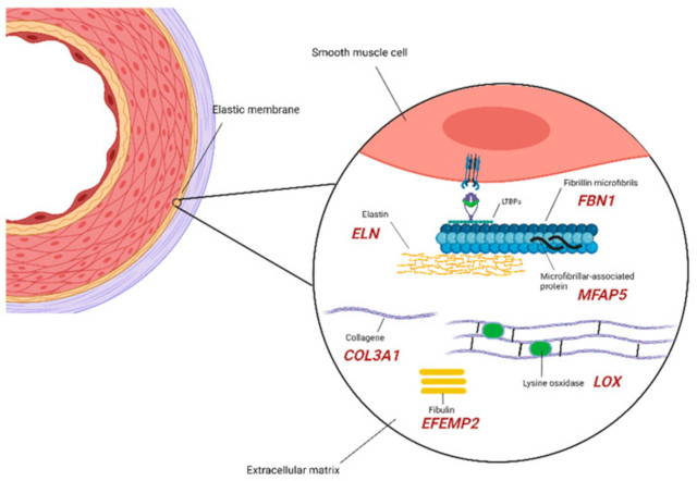 主动脉瘤特征、综合征表现和/或进展的复杂性和异质性是其发展背后的多种但独特的细胞和分子遗传机制的结果,这通常会导致相似的临床表现。正如家族聚集研究表明的那样,超过 20% 的患者至少有一个一级家庭成员患有动脉瘤,这基本上定义了受影响个体亲属的风险增加。关于该特征的遗传性的先进个线索来自病例对照研究,该研究比较了转诊胸主动脉手术患者的一级亲属中胸主动脉瘤、胸主动脉夹层和猝死的患病率,确定先证者一级亲属患这些疾病的风险高于对照组(先证者父亲、兄弟和姐妹的相对风险分别为 1.8、10.9 和 1.8)。对包含 598 名美国主动脉瘤评估患者的数据库的分析提供了更多关于促进主动脉瘤发展的遗传因素的证据,显示家族性病例的主动脉瘤生长速度较散发性病例更快,且发病年龄更小。此外,谱系也表现出不同的遗传模式(常染色体显性、X连锁、常染色体隐性)。贼近的研究也进一步证实了遗传因素在引起主动脉瘤中的作用,分析了不同类型的动脉瘤。主要通过遗传和动物模型的研究,阐明了驱动主动脉瘤形成的破坏/改变的细胞过程的组合以及特定的相关基因(表1)。在这方面,必须注意,即使这两种情况传统上被认为是不同的实体(例如,ACTA2、SMAD3),哪些致病基因对综合征和非综合征主动脉瘤都产生重叠影响(表1)。