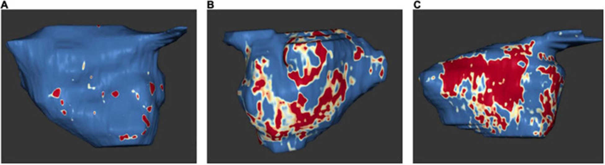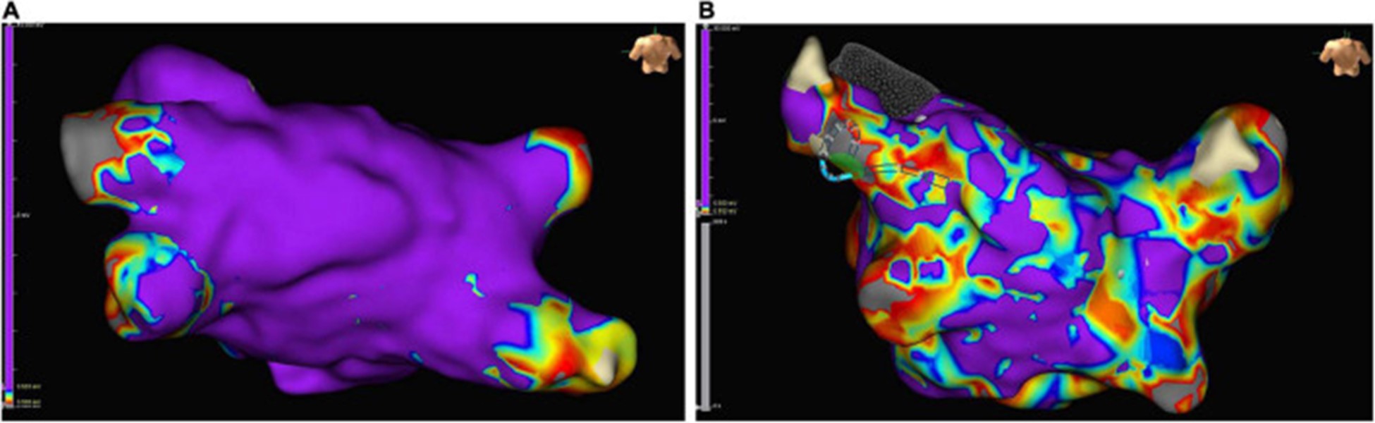 图 6:在接受肺静脉隔离的窦性心律患者的左心房心内膜标测中的低电压区域示例:正常传导的心房心肌呈紫色,低电压区域(定义为电感知幅度≤0.5 mV的区域)是颜色不同。(A)几乎没有低电压区域的左心房示例。(B)低电压区域 > 10% 的严重疾病左心房示例。