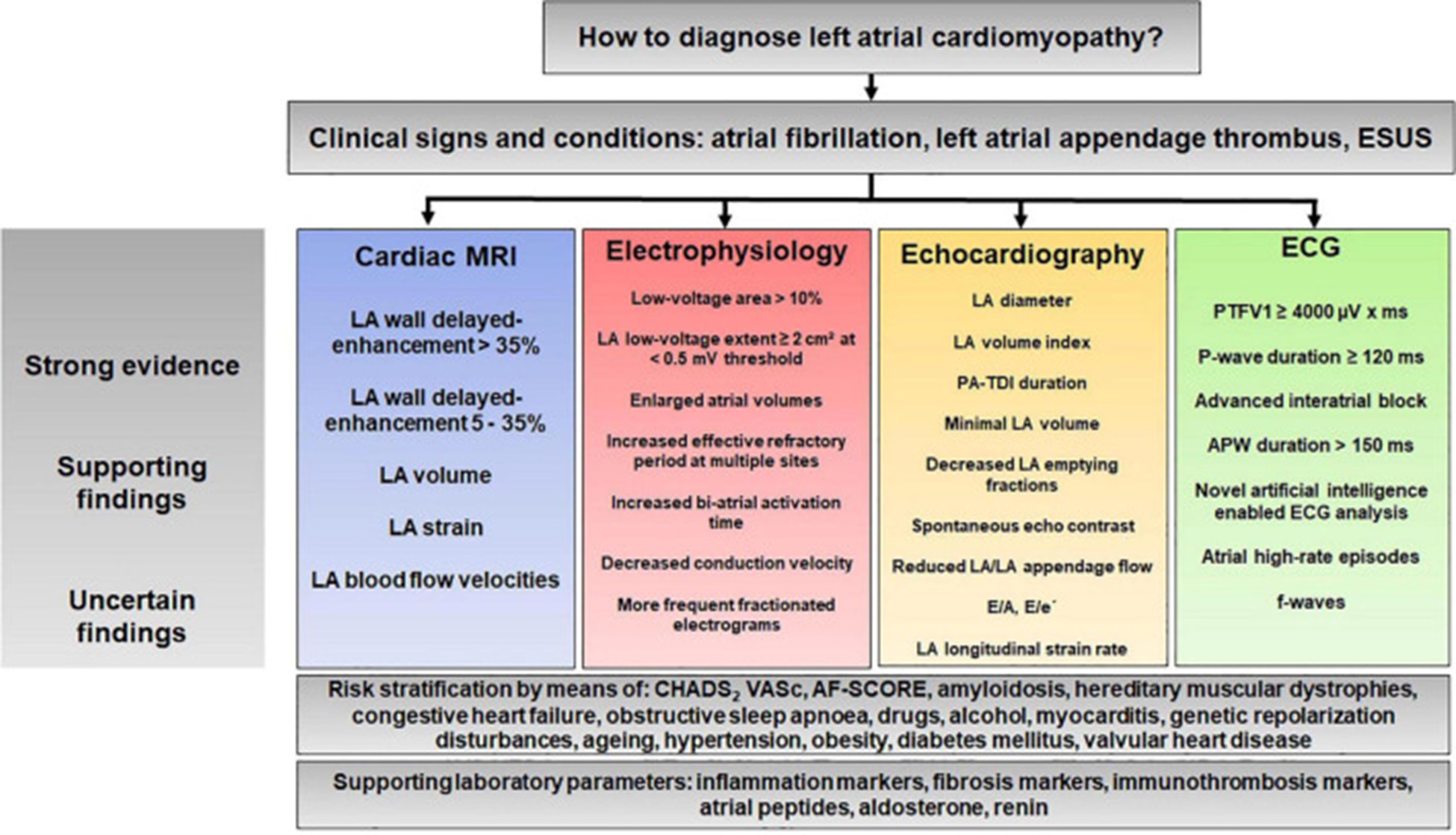 由于有几种诊断工具,对电、机械和结构性 LA 功能障碍的评估似乎是可行的。然而,单一的诊断程序可能不足以诊断 LACM。特别是,由于左心房心肌病的诊断具有挑战性,因此应寻求与左心房心肌病相关的参数组合。