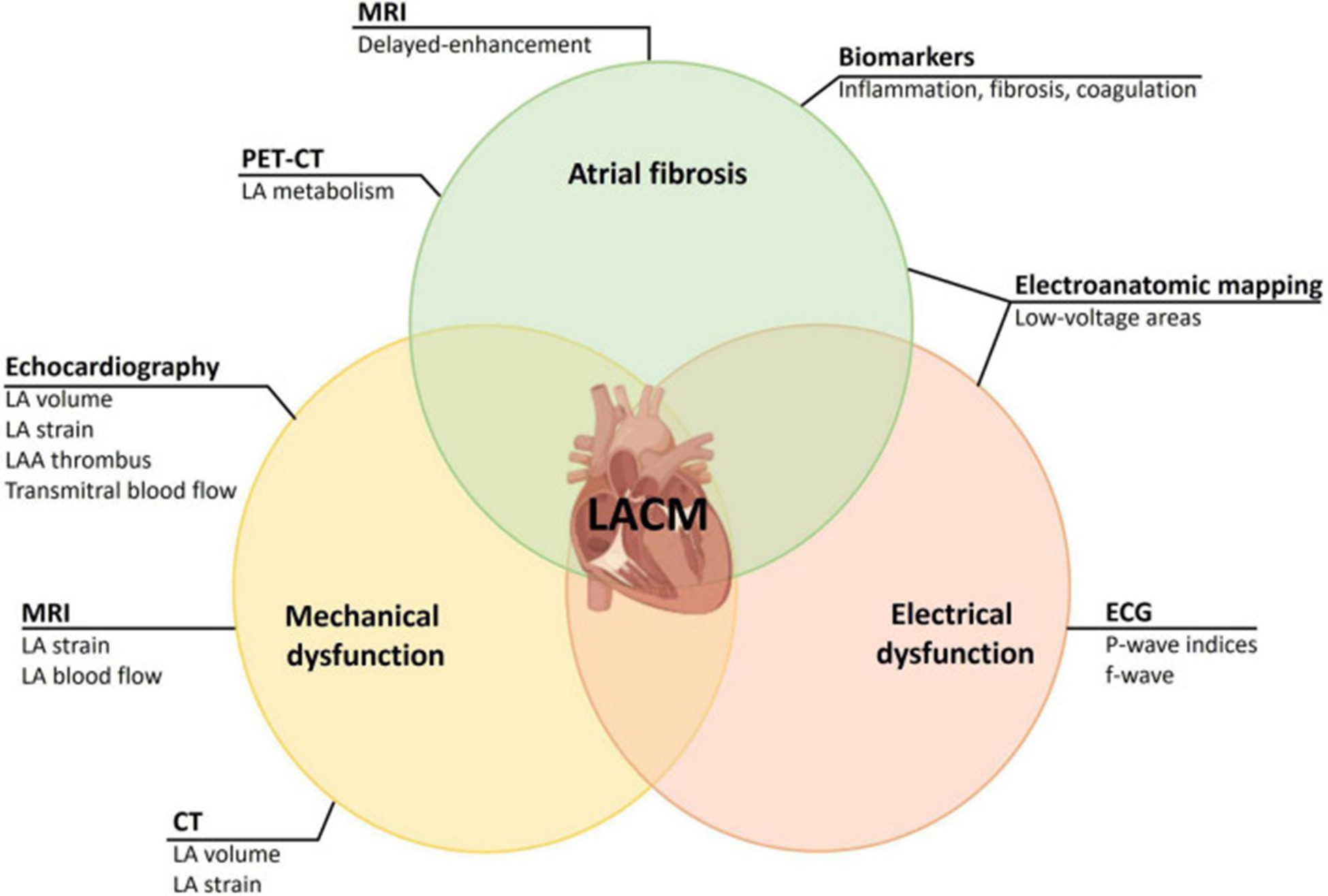 图1:LACM 图示为心房纤维化、机械功能障碍和电功能障碍的复合实体。对实体的评估是通过不同的方法实现的。CT,计算机断层扫描;心电图、心电图;f波,纤颤波;LA,左心房/左心房;LAA,左心耳;LACM,左心房心肌病;MRI、磁共振成像;PET-CT,心脏正电子发射断层扫描——计算机断层扫描。