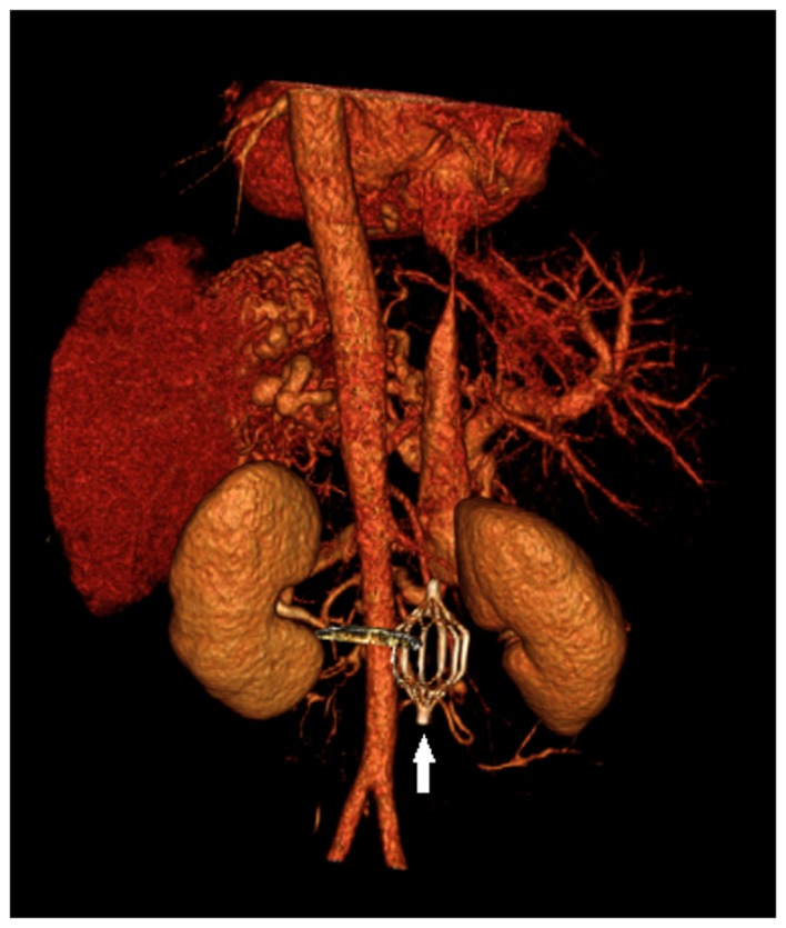 图1:受试者的计算机断层扫描血管造影图像。箭头表示下腔静脉滤器。