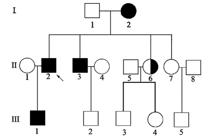 佳学基因检测在患病家族的同意下,招募了一个患有血栓形成倾向的汉族家庭。该家庭包括11名健在成员(包括先证者及受影响个体II-3、III-1),并选取了100名正常的汉族献血者作为对照。正常献血者的年龄范围(35至60岁)和性别比例(50名男性,50名女性)与患有该疾病的II-2、II-3、III-1患者的选择相匹配,且他们的年龄分别为52岁、50岁和32岁。血栓形成倾向的诊断基于典型的临床和实验室测量结果,并通过CT血管造影术(CTA)进行确认。从所有研究参与者中采集抗凝管中的外周血,并按照标准程序,使用酚-氯仿法从家庭成员和正常献血者的白细胞中提取基因组DNA。