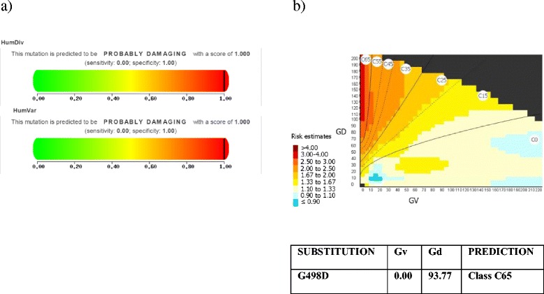 图3:数据分析。PolyPhen-2 预测表明 c.1493G>A (p.G498D) 可能破坏蛋白质的结构(基于两个不同的数据集人类多样性和人类变异)。b Align GVGD 表明 c.1493G>A (p.G498D) 是有害的(类别 65)