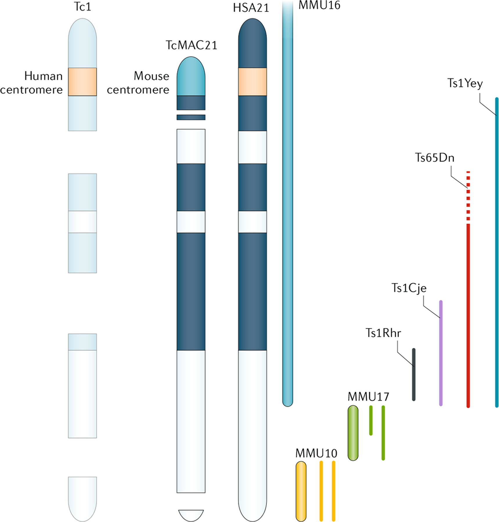 证明使用 Cre–Lox 系统可以实现定向染色体间重组,为创建用于剂量不平衡致病基因鉴定基因解码的新小鼠模型铺平了道路。迄今为止,已创建了 20 多个小鼠模型,这些模型是 MMU16、MMU17 和 MMU10 的不同 HSA21 同源部分的三体7 (图 3)。一组三个小鼠品系共同包含与 HSA21 直系同源的所有小鼠基因组区域的完整重复已被描述。理论上,这些小鼠品系的三向杂交应在八分之一的后代中产生“完全三体性”。虽然这种低频率仅在某些应用中是可以接受的,但在实践中,完全三体性的频率远低于预测的孟德尔频率,使得 Tc1 或 MAC21 小鼠等模型成为最大限度基因表现的最可行选择。
