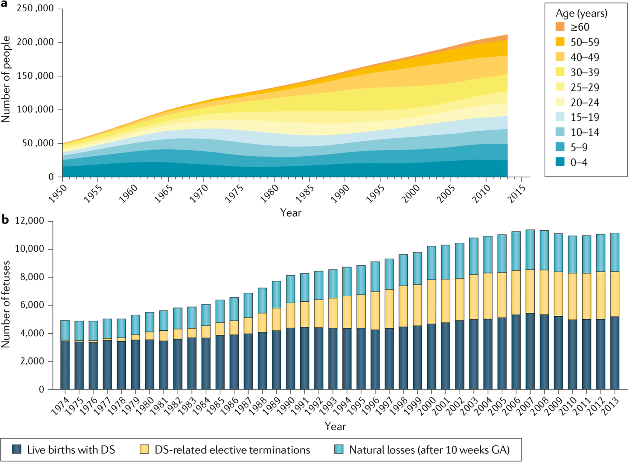随着全球人口的增长,唐氏综合征的终生患病率也大幅上升。例如,在美国,唐氏综合征的人口患病率从 1950 年的约 50,000 人(每 10,000 人中有 3.3 人)增加到 2013 年的约 212,000 人(每 10,000 人中有 6.7 人),这主要是由于唐氏综合征患者的儿童生存率提高 (图 2:在美国,唐氏综合征患者的预期寿命从 1950 年估计的平均 26 岁和中位数 4 岁增加到 2010 年的 53 岁和 58 岁。截至 2015 年,已报告唐氏综合征人口患病率估计值为欧洲(每 10,000 人中有 4.9 人)、欧洲(不包括前东欧集团国家)(每 10,000 人中有 6.0 人)和前东欧集团国家(每 10,000 人中有 3.3 人)。但是,除非在各国建立更多的出生登记并获得更多关于世界不同地区唐氏综合征患者历史和当前生存率的数据,否则无法可靠地计算出准确的全球估计值。