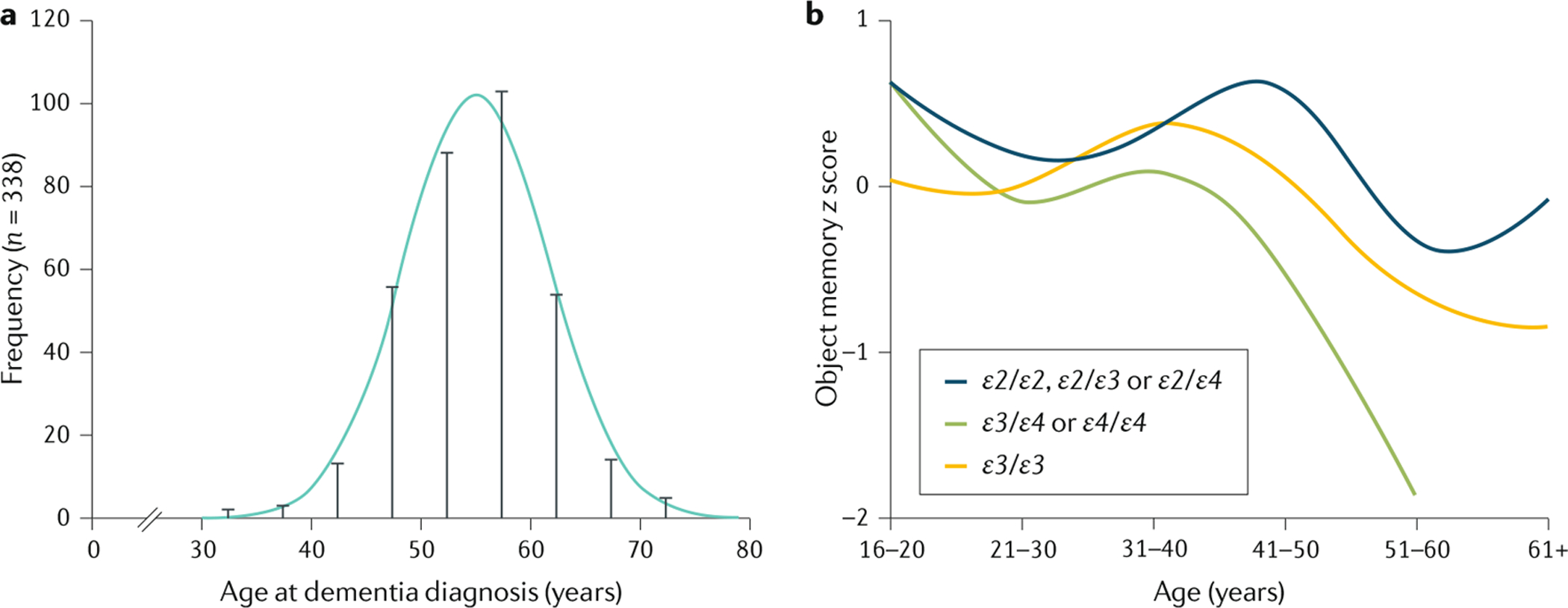a:唐氏综合症 (DS) 患者痴呆症诊断年龄的分布。唐氏综合症患者患阿尔茨海默病的风险与年龄密切相关。痴呆症诊断的平均年龄为 55 岁,不过有些人从 40 岁开始就出现认知能力下降,而其他人直到 60 岁以后才被诊断出来。b | 唐氏综合症患者的认知能力下降,以记忆测试的表现 ( z分数)来衡量。来自伦敦唐氏综合症联盟的横断面数据显示了唐氏综合症患者的物体记忆任务测试分数按年龄和载脂蛋白 E ( APOE ) 基因型分布。该任务是衡量短期和延迟记忆的,适合唐氏综合症患者。要求参与者通过两次立即回忆试验和一次 5 分钟后的延迟回忆试验来命名和回忆七个物体250。根据APOE基因型对数据进行拆分,以比较APOE的ε4等位基因(APOE ⋆ ε4;增加晚发型散发性阿尔茨海默病的风险)与APOE ⋆ ε2等位基因(降低 AD 风险)和APOE ⋆ ε3等位基因(对 AD 风险有中性影响)对认知表现的影响。具有APOE ⋆ ε3 / APOE ⋆ ε4或APOE ⋆ ε4 / APOE ⋆ ε4基因型的个体的认知能力从 40 岁开始下降,明显早于痴呆症诊断的平均年龄,也早于具有APOE ⋆ ε2 / APOE ⋆ ε2、APOE ⋆ ε2 / APOE ⋆ ε3、APOE ⋆ ε2 / APOE ⋆ ε4或APOE ⋆ ε3 / APOE ⋆ ε3基因型的个体。a 部分改编自 REF. 251,CC-BY-4.0(https://creativecommons.org/licenses/by/4.0/)。