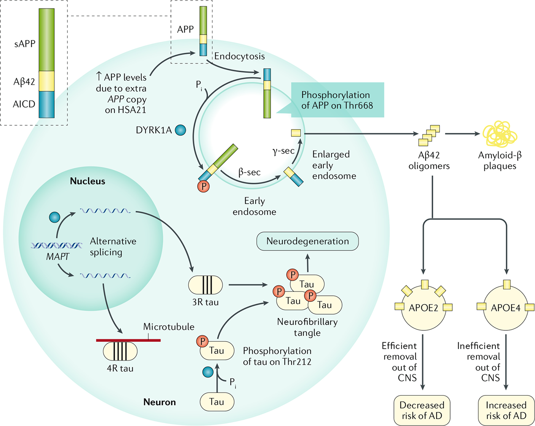 患有唐氏综合征 (DS;21 三体综合征) 的个体中,人类21 号染色体 (HSA21)上APP(编码淀粉样蛋白前体 (APP))和DYRK1A(编码双特异性酪氨酸磷酸化调节激酶 1A (DYRK1A))基因剂量的增加,增加了他们患阿尔茨海默病 (AD) 的风险。APP 可经受非淀粉样变性加工(未显示)和淀粉样变性加工,由 β-分泌酶 1 (β-sec) 和 γ-分泌酶 (γ-sec) 产生神经毒性 Aβ42 肽。APP 水平升高会导致 Aβ42 水平升高,而 DYRK1A 对 APP 在 Thr668 位点的磷酸化会增加 APP 的淀粉样变性加工。DYRK1A 在细胞中还有其他靶标,包括剪接因子和微管结合蛋白 tau。剪接因子的 DYRK1A 磷酸化会改变MAPT mRNA(编码 tau)的剪接,导致含有三个微管结合结构域(三重复 (3R) tau)的 tau 水平升高,而 4R tau 水平降低。这种不平衡会导致神经原纤维缠结 (NFT) 的形成,可能是因为 3R tau 对微管的结合亲和力较低。此外,tau 中 Thr212 的 DYRK1A 磷酸化会改变蛋白质的构象,降低 tau 对微管的亲和力并导致 NFT 形成。APOE 的 ε4 等位基因(APOE ⋆ ε4)的存在会改变Aβ 249的加工、沉积和清除,因此是 AD 的主要风险等位基因。AICD,APP 胞内结构域;APOE,载脂蛋白 E;CNS,中枢神经系统; P i,无机磷酸盐;sAPP,可溶性淀粉样蛋白前体。