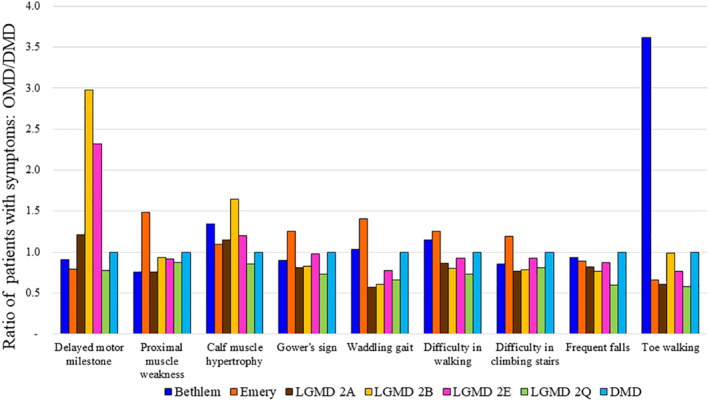 图 5.比较其他肌营养不良症 (OMD)和 DMD 中观察到的症状,发现存在明显的重叠。将具有九种症状的患者人数与 DMD 患者人数的比例进行了比较。(比例 = OMD/DMD)。比例 >1 表示特定其他肌营养不良症 (OMD)中症状的发生率更高。OMD:其他肌营养不良症:DMD 杜氏肌营养不良症。