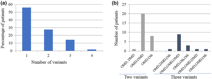 图 4.带有与 OMD、DMD 或其他疾病相关的基因的两个或多个变异的患者。 (a) 队列中带有一个、两个、三个或四个变异的患者百分比。 (b) 带有两个或三个变异且在真正的基因中带有特定变异的患者数量,这些变异是 DMD、OMD(其他肌营养不良症)和/或其他疾病(Oth)。