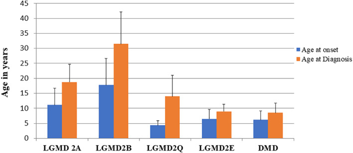比较该队列中 LGMD 患者的发病年龄和诊断年龄(图 3),并与 DMD 进行比较,结果表明,LGMD2B 患者的两项指标之间的差异最大(13.8 岁),其次是 LGMD2Q(9.7 岁)和 LGMD2A(7.1 岁)。临床上最严重的肌营养不良症 DMD(3.9 岁)和 LGMD2E(4.2 岁)的发病年龄和诊断年龄之间的差异似乎最小。