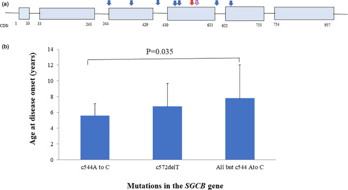 图 2.LGMD2E 患者SGCB基因的突变和功能特征。(a)SGCB 基因的组织显示六个外显子,cDNA 坐标编号如下。蓝色箭头表示患者中发现的单个突变的位置。红色箭头表示最常见的 c.544A>C 变体;粉色箭头:显示 c572delT 变体的位置。外显子 1 和 2 编码 IC 结构域,外显子 2 和 3 编码跨膜结构域;外显子 3、4、5 和 6 编码 EC 结构域,外显子 1 和 6 包含 5′ 和 3′ 非编码序列。(b)根据 LGMD2E 患者发病年龄比较 SGCB 基因中不同突变的疾病严重程度。除 544 a 到 C 外,其他均指除 c.544A>C 之外的所有变体。计算出的p值为 0.035 被认为具有统计学意义。