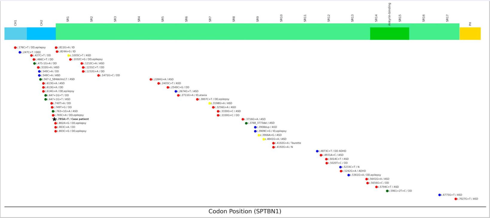 图4:βII-频谱蛋白功能域示意图。CH1(天蓝色)、CH2(蓝色)、SR(绿色)、PH(黄色)。标示了SPTBN1变体的位置。错义变体(红色)。终止增益/移码变体(蓝色)、剪接位点变体(深绿色)、同义变体(黄色)、其他变体(黑色)。CH1,钙调蛋白同源域1;CH2,钙调蛋白同源域2;SR,频谱蛋白重复序列;PH,普莱克底物蛋白同源域;ASD,自闭症谱系障碍;DD,发育迟缓;ADHD,注意力缺陷多动障碍;ID,智力障碍;EIEE,早期婴儿癫痫性脑病;N,未知。我们病例中的患者也标有黑色星号。