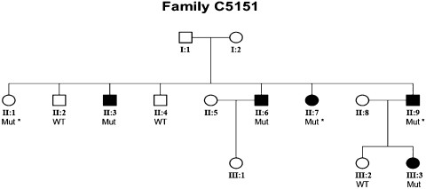 图 2:该家族的系谱,显示有和没有 AMCD1的成员。黑色阴影表示马蹄内翻足,星号表示手部挛缩。MYH3 F437I 突变的存在用“Mut”表示,不存在用“WT”表示。