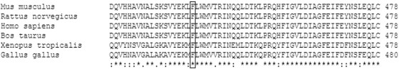 图 3:多个物种序列中与 F437I 突变对应的位置周围的 MYH3 氨基酸比对。残基 437 处的苯丙氨酸由矩形表示,并且在所示的所有物种中都是保守的,包括小鼠、大鼠、人、牛、青蛙和鸡。使用 CLUSTALW 程序 ( http://align.genome.jp ) 对序列进行比对。