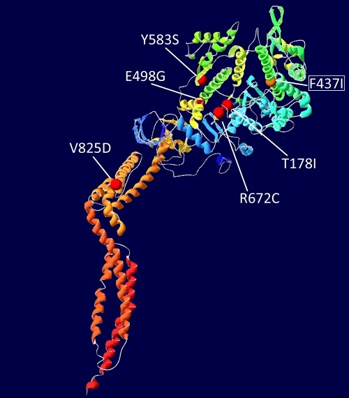 图 4:包含氨基酸 4 到 1022 的 MYH3 S2(肌球蛋白头)区域的带状图。在具有 AMCD1的家族中鉴定的 MYH3 F437I 突变的位置以橙色显示。导致 2A 型远端关节弯曲(Freeman-Sheldon 综合征)的其他五个已知突变的位置以红色显示;其中四个位于肌球蛋白头部并位于形成 ATP 结合位点凹槽中。该图像由 Swiss-PDBViewer (DeepView) 程序 ( http://ca.expasy.org/spdbv ) 为蛋白质登录号P11055 (MYH3)生成。