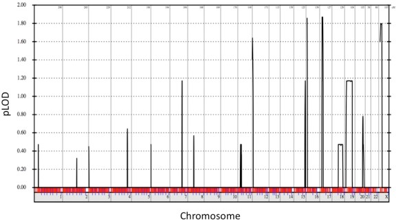 图 5:1 型远端关节挛缩症与染色体 17p 的联系。从 Affymetrix 10K 阵列数据构建的 1 型远端关节挛缩症家族的参数化多点 LOD(几率的对数)分数的全基因组概况。从 p 端(左)到 q 端(右)的人类染色体在水平轴上连接在一起。垂直轴显示了水平轴上指示的人类染色体上物理位置的参数 LOD 分数。1.86 的峰值 LOD (pLOD) 得分(定义贼强的连锁区域)位于染色体 17p 内。