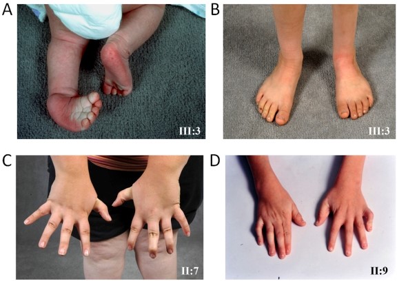 图1:1型远端关节挛缩症家族成员的远端肢体挛缩。A:先证者的脚(鉴定为III:3 in图 2), 显示左脚单侧马蹄内翻足。B:使用 Ponseti 方法矫正马蹄内翻足后先证者的脚,在 7 岁时显示出有限的残余畸形。C:先证者阿姨的近端拇指和远端指间关节挛缩(确定为 II:7 in图 2). D:先证者父亲的弯曲指畸形(鉴定为 II:9 in图 2).