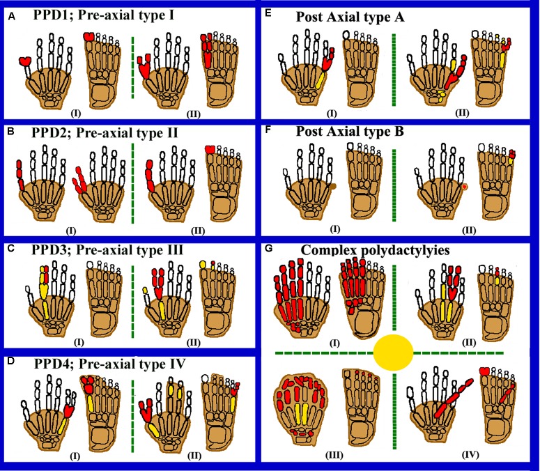 图1:展示轴前、轴后和复杂多指畸形的 autopod 卡通图。红色填充元素表示受影响/多指的手指。黄色填充元素表示发育不良/发育不全的骨骼,阴影手指表示并指。(A)代表 PPD1,包括 (I) 拇指分叉、拇趾多指畸形和 (II) 拇指和拇趾重复。(B)代表 PPD2,包括 (I) 对生三指节拇指和 (II) 非对生三指节拇指。(C)代表 PPD3,包括 (I,II) 第二手指重复。(D)代表 PPD4,包括 (I) 趾蹼(交叉型 I)和 (II) 手指/趾蹼(交叉型 II)。(E)代表 PAPA,具有 (I) 发育良好的第五指和 (II) 第 (5) 第五指更近端的分支。(F)代表 PAPB、(I) 带蒂后小指和 (II) 双裂第五趾带蒂后小指。(G)代表复杂多指畸形 (I),显示镜像前轴重复。(II) 手和脚的中央多指畸形(中轴)。(III) 具有完全并指畸形的 Haas 型多指畸形。(IV) 掌侧/背部多指畸形。