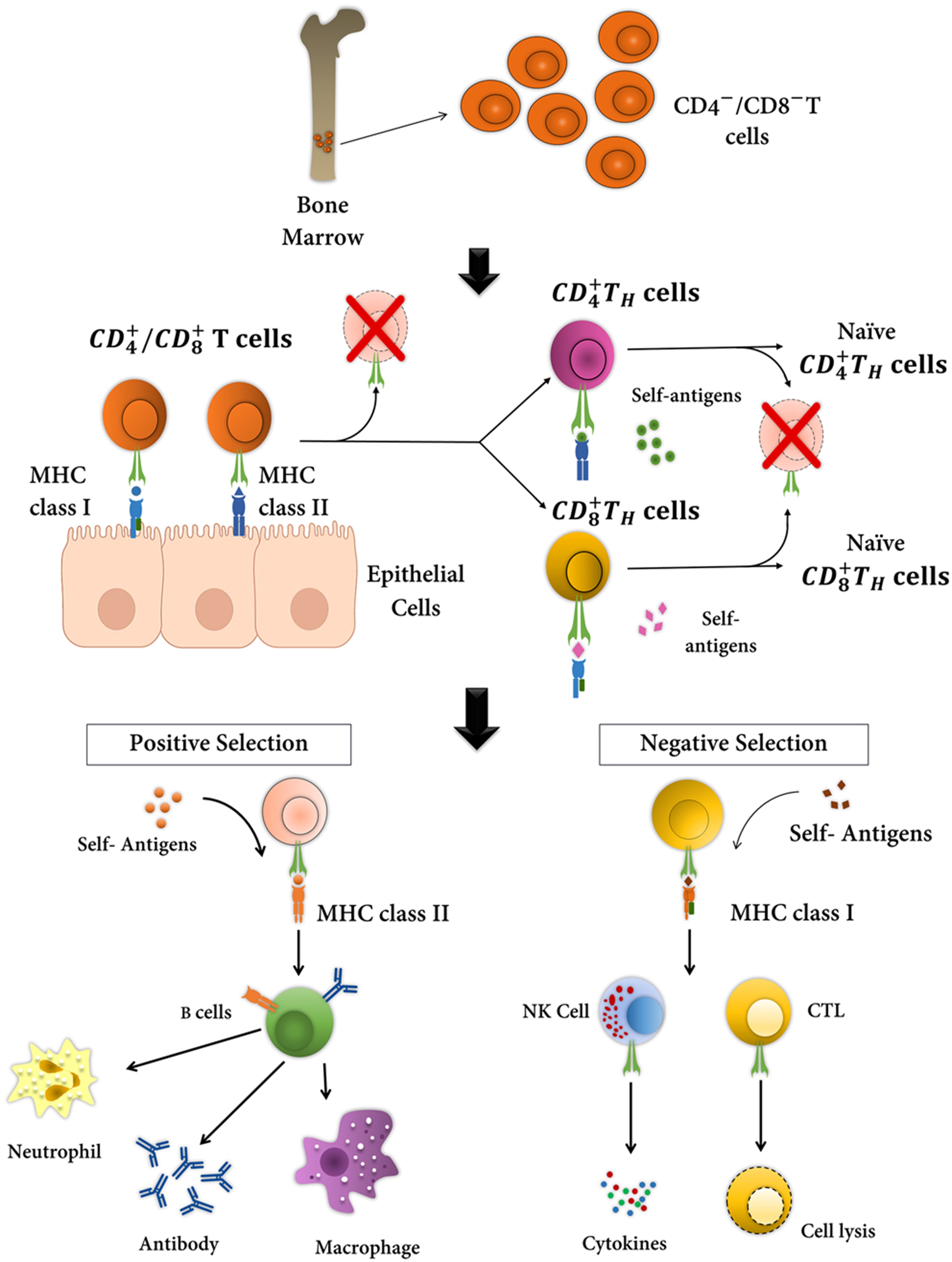 图 2:在中枢耐受和免疫反应相关通路中,由格雷夫斯病相关基因编码的细胞和分子在 T 细胞和其他免疫细胞中的作用。祖细胞 T 细胞在骨髓中产生。需要胸腺中的阳性和阴性选择来耗尽非功能性和自身反应性 T 细胞。在阳性选择过程中,抗原呈递 HLA 分子与未成熟的 T 细胞结合并向 T 细胞提供生存信号。在负选择过程中,自身反应性 T 细胞通过与自身抗原结合而被识别。这些 T 细胞被区分为自身反应性 T 细胞并经历细胞凋亡。外源蛋白由抗原呈递细胞(APCs)获得,转化为抗原,与MHC II类分子结合,呈递在APC表面被CD4 +识别T 细胞。如果抗原被识别为外来抗原,B 细胞将被激活,随后抗体分泌,巨噬细胞和中性粒细胞被细胞因子的 CD4 + T 细胞募集。内部来源的抗原与 HLA I 类分子结合并呈递在细胞表面以供 CD8+ T 细胞识别。如果抗原被检测为外来抗原,则细胞破坏由细胞毒性T细胞和NK细胞进行。该通路的格雷夫斯病相关变体已在CTLA4PTPN22IL2RA中报道。