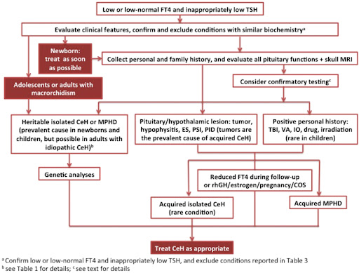 - 生化检查结果(低,甚至低-正常,游离 T4 与不适当的低/正常 TSH)——这是最常见的情况,可能在出生时发生,因为新生儿筛查呈阳性或在已知下丘脑病变患者的生化检查期间– 垂体区或在其随访期间;