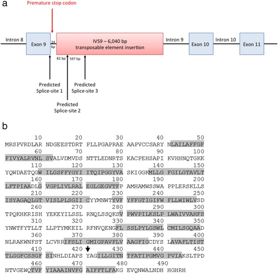 图 4:使用 NetGene2 和 ASSP 进行的剪接位点分析表明,在存在插入的情况下,除了出现在外显子内含子边界的正确剪接位点之外,插入中还存在另外两个剪接位点 ( a )。这些交替剪接事件导致移码突变,从而导致氨基酸 421 处的过早终止密码子,如箭头 ( b ) 所示。灰色阴影表示唾液酸蛋白的 12 个跨膜区域