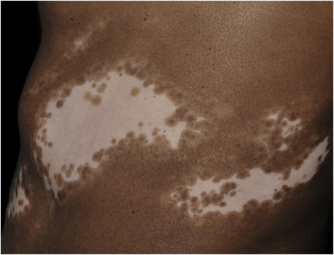 图1:深色皮肤患者侧腹的节段性白癜风。无色斑,呈带状分布;病变周围有白斑带,有数个毛囊复色点