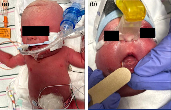 (a)出生1天的女性胎儿,头部、躯干和四肢出现角化过度斑块。头皮毛发、眉毛和睫毛缺失。(b)下颌前部有两颗小的先天性牙齿。