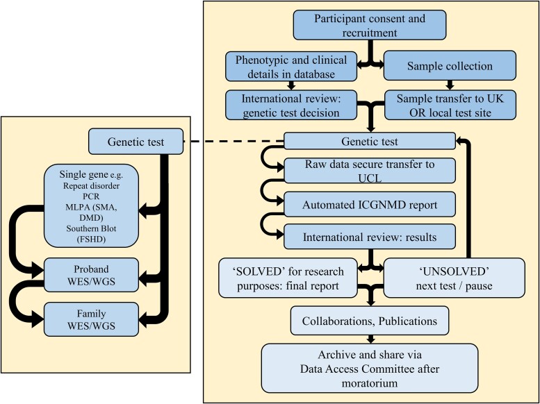 图1:ICG神经肌肉疾病(NMD)工作流程,包括基因分析决策和结果审查中的国际讨论关键节点。ICG神经肌肉疾病(NMD)研究员的培训涵盖了这一途径。DMD = 杜氏肌营养不良症;FSHD = 面肩肱型肌营养不良症;MLPA = 多重连接依赖性探针分析;SMA = 脊髓性肌萎缩症;WES = 全外显子组测序;WGS = 全基因组测序。