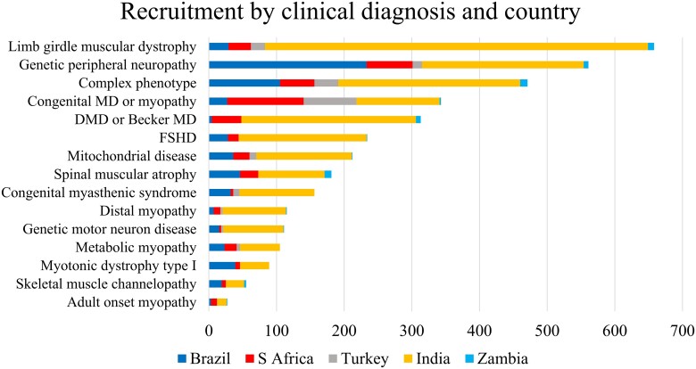 图 2:按招募家庭/地区划分的 REDCap 临床诊断类别招募。蓝色 = 巴西;灰色 = 土耳其;浅蓝色 = 赞比亚;红色 = 南非;黄色 = 印度。DMD = 杜氏肌营养不良症;FSHD = 面肩肱型肌营养不良症;MD = 肌营养不良症。