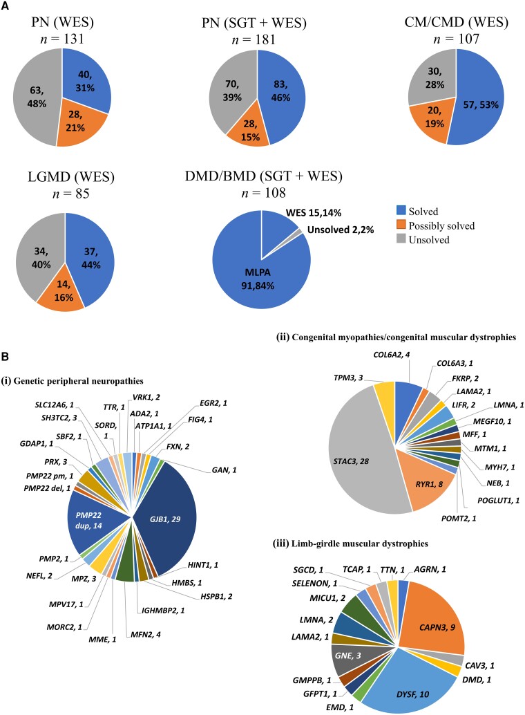 截至 2023 年 1 月,神经肌肉疾病基因检测将报告 978 项新的基因分析(包括 547 例先证者 WES 和 274 例先证者 SGT),遵循图。1. 50% 的接受 SGT 的患儿得到了解决(补充表 4)。先进次患儿 WES 数据审查确定了 223 个(41%)需要“解决”的变异和 83 个(15%)“可能解决”参与者 神经肌肉疾病(NMD)的变异(合并 WES 解决/可能解决率为 56%)。单基因测试和 WES 相结合产生了 43.8% 的“解决”结果。以下是深入审查患儿单基因测试和 WES 结果后的遗传摘要数据,这些结果针对招募水平贼高的四个临床诊断类别(PN、LGMD、CMD/CM 和 DMD/BMD),以证明第 4 年阶段的项目价值。这些类别合计代表了 3631 名研究患儿中的 1875 名(占队列的 51.6%)和 2023 年 1 月可用的 547 个外显子组中的 340 个(62%)