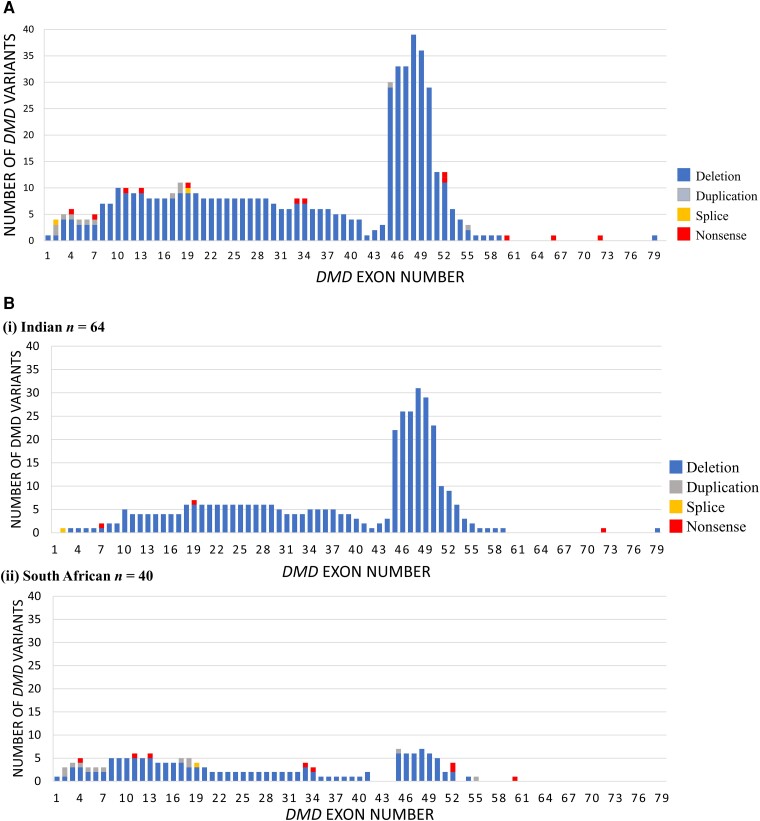 图 5:杜氏肌营养不良症 (DMD) 变异的分布。( A )整个群体中致病性DMD遗传变异的外显子分布。( B ) ( i ) 印度和 ( ii ) 南非群体中致病性DMD遗传变异的外显子分布。蓝色 = 缺失;灰色 = 重复;橙色 = 剪接;红色 = 无意义。