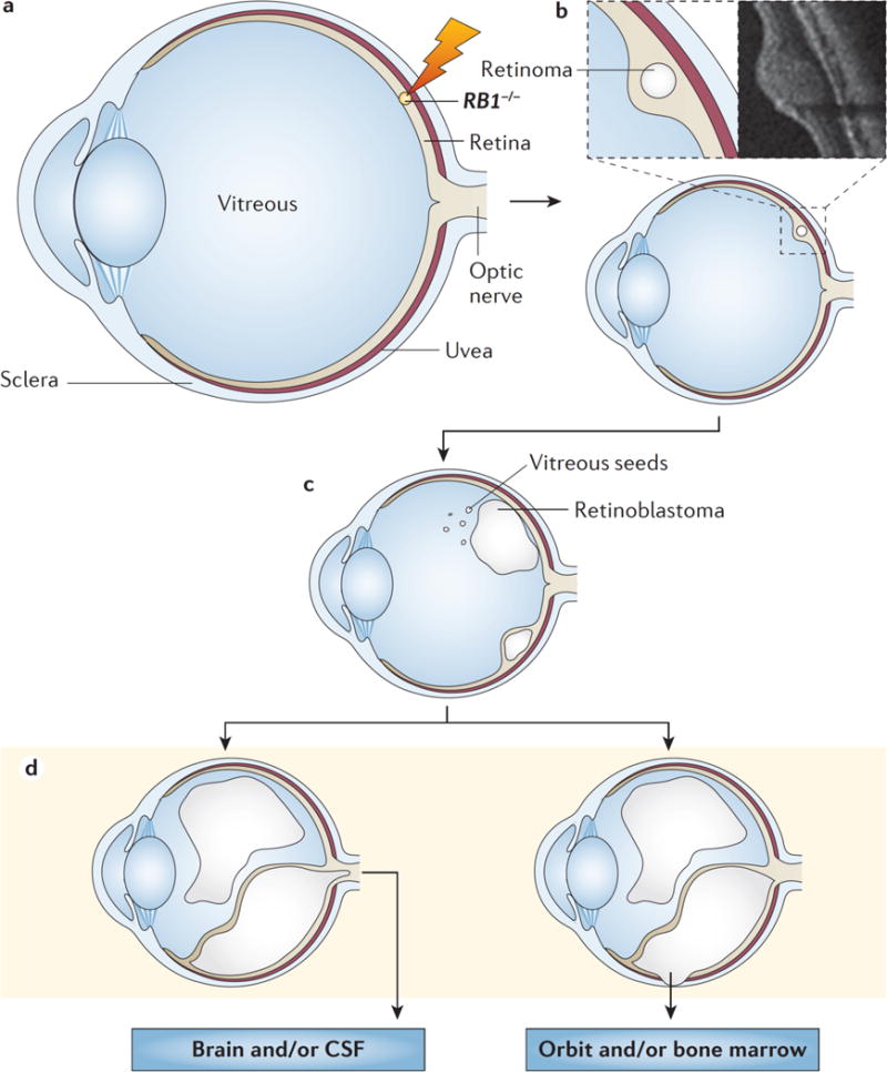 视网膜母细胞瘤在RB1 −/−视网膜细胞经历有限增殖形成非恶性视网膜瘤后开始(图1) ,遗传或表观遗传变化导致不受控制的增殖后会形成视网膜内肿瘤。贼常见的是,当通过瞳孔看到白色肿瘤(白瞳)或遮挡视力时,首先会检测到这种情况。如果及早发现,及时治疗可以治好癌症并挽救眼睛。然而,延迟诊断可能会导致无法治好的视神经和大脑侵犯,或导致身体其他部位的转移,有时可以通过广泛的干预来治好。