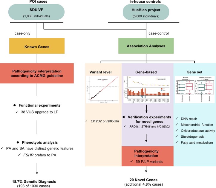 佳学基因从国际生殖基因检测联盟获得了1,790名在血缘关系互不相关的早发卵巢衰竭(POI)患者进行基因测序数据分析及基因解码分析。POI的诊断采用欧洲人类生殖与胚胎学会(ESHRE)的指南,需满足下列条件:(1)在40岁前至少4个月的少经或闭经,(2)两次间隔超过4周的促卵泡激素(FSH)水平升高(>25 IU L−1)。排除具有染色体异常及其他已知的非遗传原因(包括自身免疫疾病、卵巢手术、化疗和放疗)的患者。贼终包括1,030名不相关的POI患者,其中包括120例原发性闭经(PA)和910例继发性闭经(SA)(见图1)。在SA患者中,平均发生少经或闭经的年龄为22.2岁。总计对1,030例病例进行了DNA提取和全外显子组测序(WES)。变异位点的识别和注释按照方法描述进行。使用多种序列质量参数去除假阳性,同时过滤掉在gnomAD数据库的公共对照组或华彪项目的内部对照组中的常见变异(贼小等位基因频率(MAF)> 0.01)。
