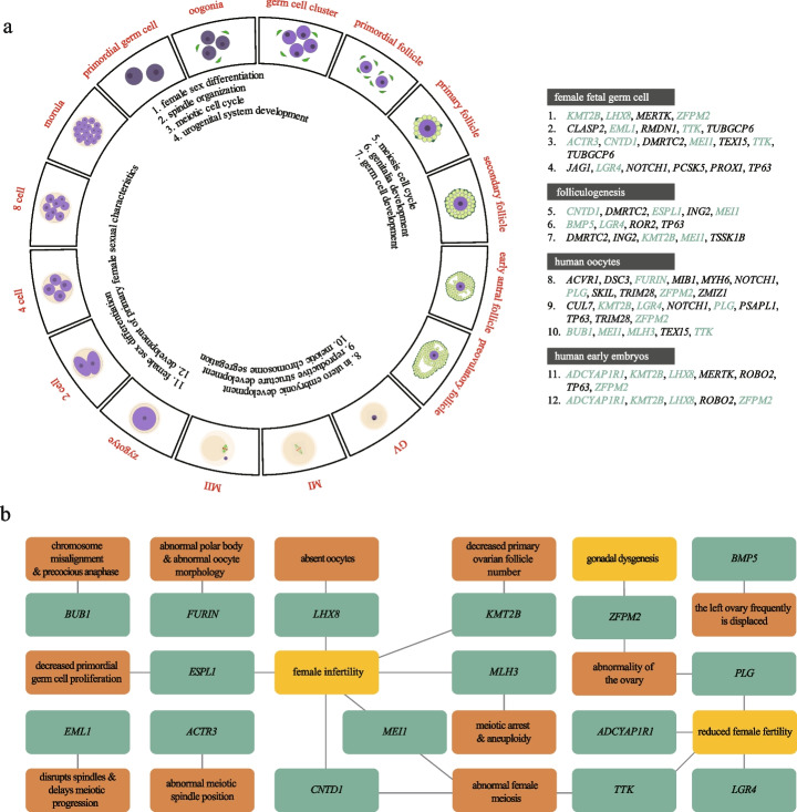 DNM基因参与与女性生殖相关的通路。a对女性生殖细胞进行动态基因表达聚类,包括女性胎儿细胞、卵泡发生过程中的卵母细胞、成熟卵母细胞和早期胚胎。女性生殖细胞细分为十六个阶段,使用阶段特异性基因进行GO分析。在女性生殖细胞的十六个阶段可视化显著富集的GO术语(p < 0.01),并在右侧列出通路及其相关基因(与女性生殖缺陷相关的基因标记为绿色)。b代表性小鼠基因组信息学(MGI)和PubMed表型注释的网络连接(绿色:与女性生殖缺陷相关的基因;橙色:女性不育表型;棕色:生殖细胞缺陷描述)