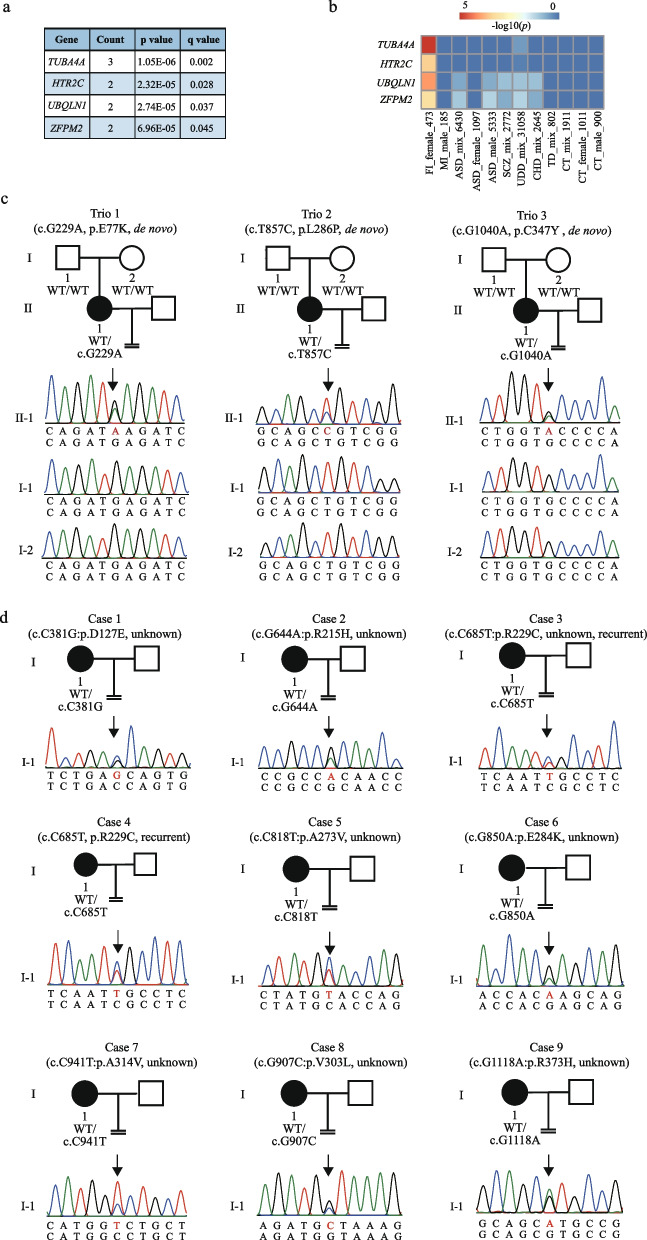 我们筛选了多个可能与女性不孕相关的基因,最终选择了TUBA4A、UBQLN1、HTR2C和ZFPM2四个基因进行深入分析。在TUBA4A基因中,我们发现了三个不同的致病性突变(E77K、L286P和C347Y),并通过RNA水平验证了其中一个突变。