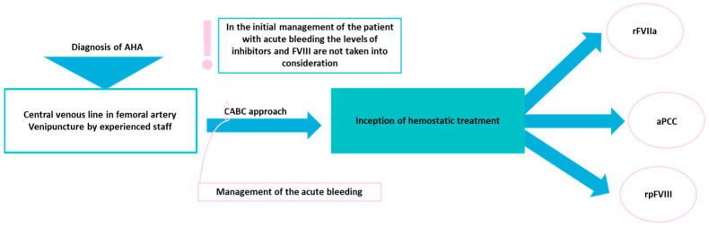 图 2:AHA 患者急性出血事件的管理。AHA:获得性血友病 A;FVIII:第 VIII 因子;CABC:循环气道呼吸循环;rFVIIa:重组第 VIIa 因子;aPCCs:活化凝血酶原复合物浓缩物;rpFVIII:重组猪 FVIII。