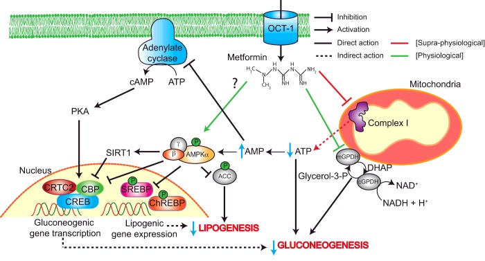 二甲双胍抑制复合物I的结果是ATP生成减少,同时ADP和AMP水平增加。这种改变的细胞能量电荷由细胞的主要能量传感器AMP活化蛋白激酶(AMPK)检测。